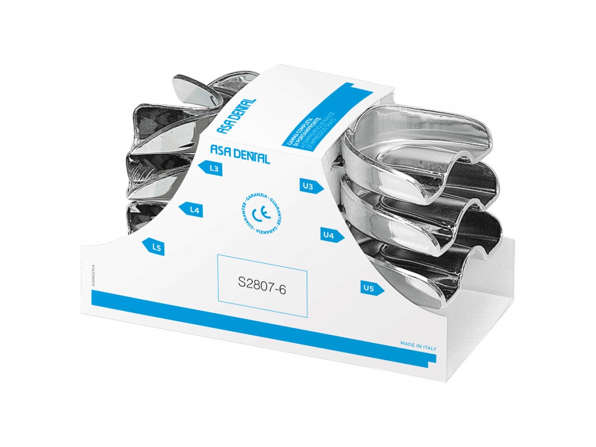Ложка слепочная без перфорации с бортиками, набор 6 штук (S,M,L верхние и нижние). С пластиковым цветокодиковынным кружком, удобно держать при снятии слепка. Производитель: Asa Dental, Италия.