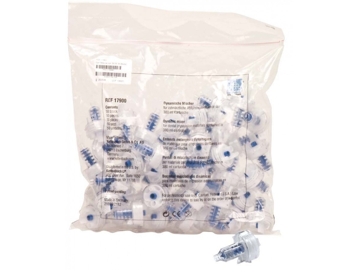 Чтобы обеспечить однородное смешивание наших оттискных материалов, мы рекомендуем использовать в зависимости от вида схватывания подходящую систему смешивания. Для большого картриджа объемом 380 мл (соотношение 5:1) производства Kettenbach следует применять динамические смесители с цветной маркировкой (голубые), гарантирующие оптимальное соотношение при смешивании.