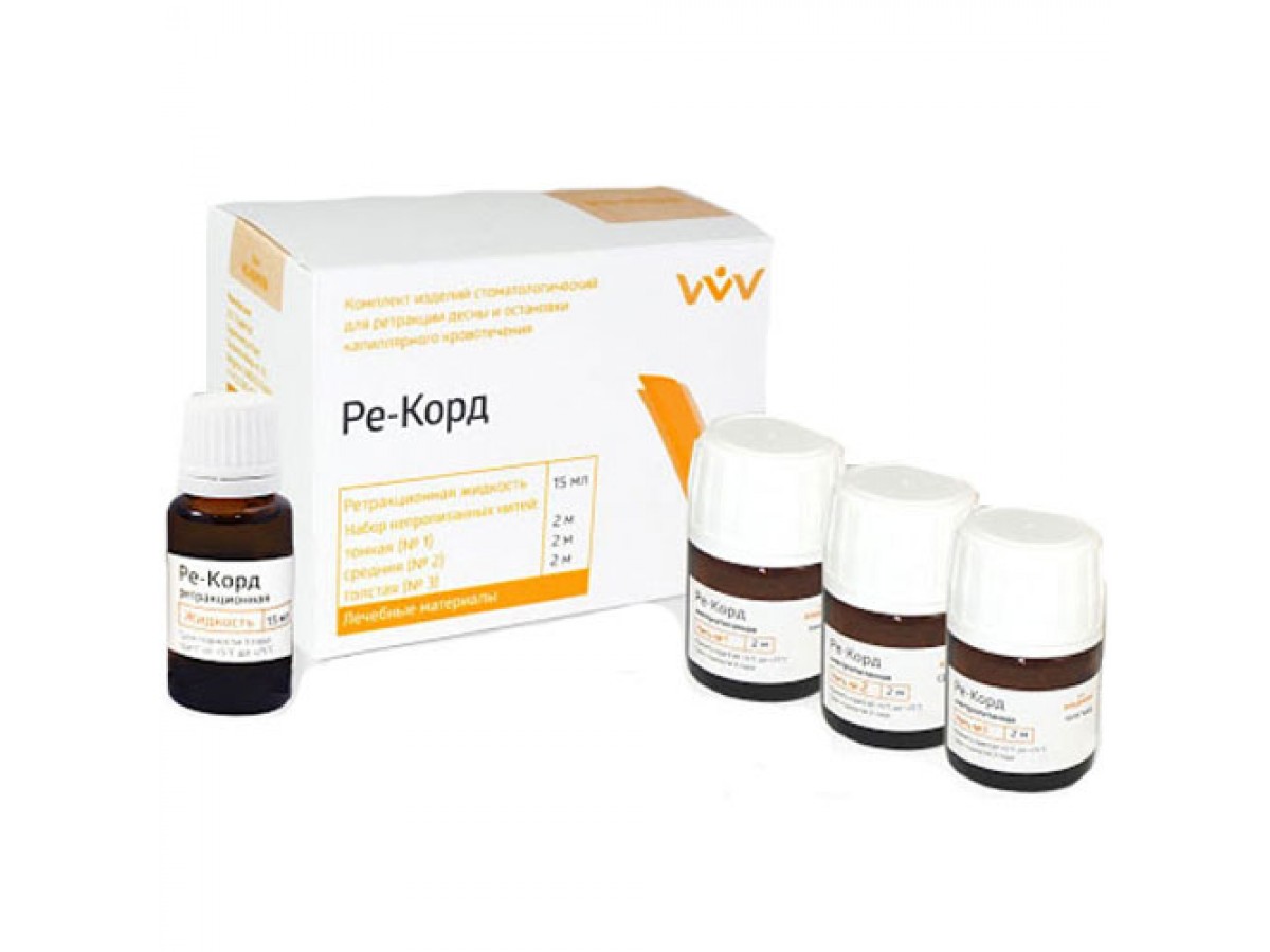 Ре-Корд - ретракционная нить представляет собой готовую к применению форму: скрученные хлопковые волокна, обработанные по специальной технологии. Терапевтический эффект жидкости «Ре-Корд» связан с вяжуще-сокращающими свойствами хлористого алюминия, входящего в состав. Производитель: ВладМиВа, Россия.
