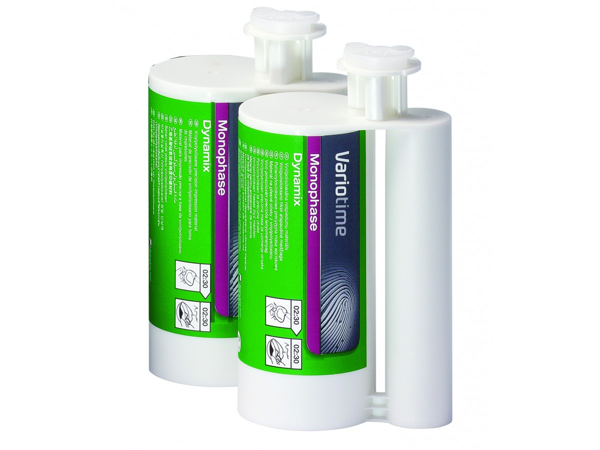 Variotime Dynamix Monophase - А-силиконовый оттискный материал, который используется в стоматологии для создания оттисков, в том числе и монофазных. После отвердения не теряет своей формы, готовый слепок легко вынимается изо рта пациента, обладает хорошей стабильностью. Может использоваться для тонких видов препарирования. При необходимости можно легко подрезать лишние части. В наборе два картриджа по 380 мл каждый, два наконечника для смешивания, и одно фиксирующее кольцо. Доступен для автоматического или ручного смешивания.