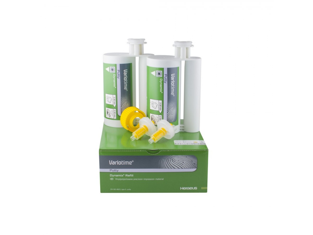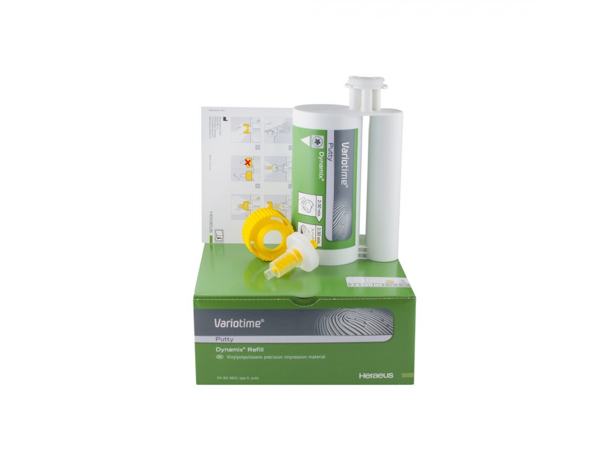 Оттискной материал, Variotime Dynamix Putty в картриджах Dynamix, выпускается для автоматического смесителя. Удобен при проведении двойного смешивания, легко подрезается, незаменим при создании оттисков по "сэндвич" методике. Обладает высокой финальной твердостью, создавая малодеформируемые оттиски. Производитель: Kulzer Mitsui Chemicals Group, Германия.