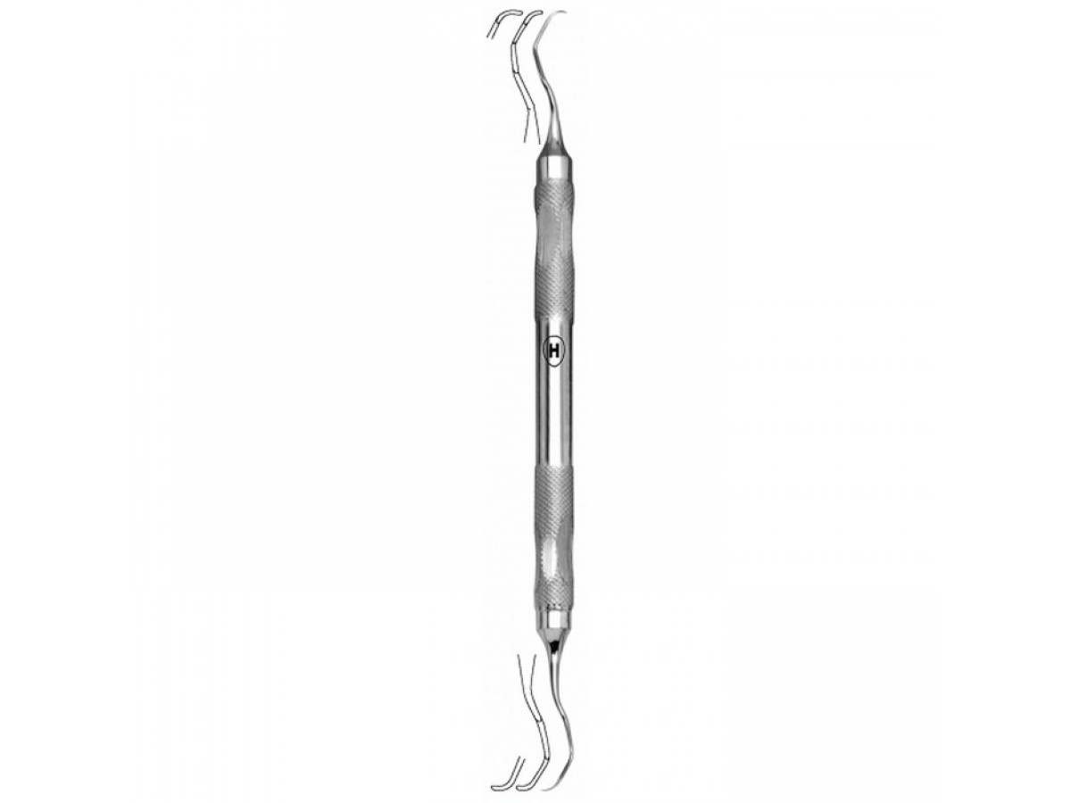 Длинная, изогнутая рабочая часть облегчает доступ к премолярам и молярам. Длина хвостовика 9 мм. Облегченная ручка с ретенционным узором обеспечивает удобство использования.