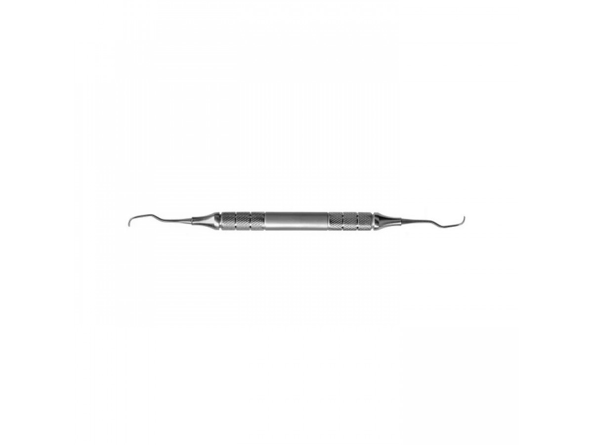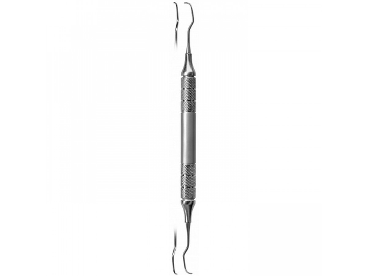 Короткий угол рабочей части облегчает доступ к клыкам и резцам. Ручка с ретенционным узором обеспечивает удобство использования.