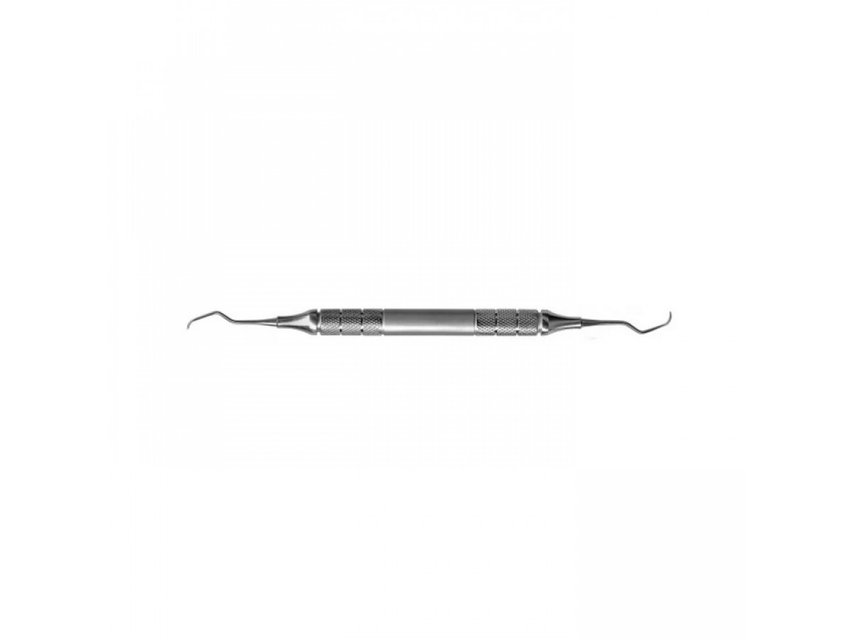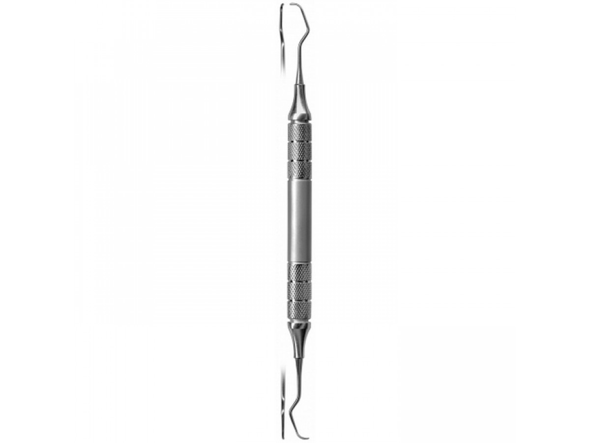 Короткий угол рабочей части облегчает доступ к клыкам и резцам. Ручка с ретенционным узором обеспечивает удобство использования.