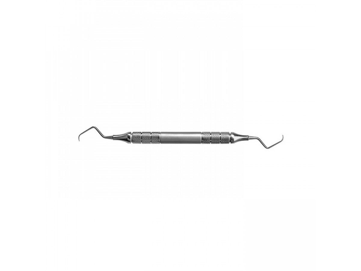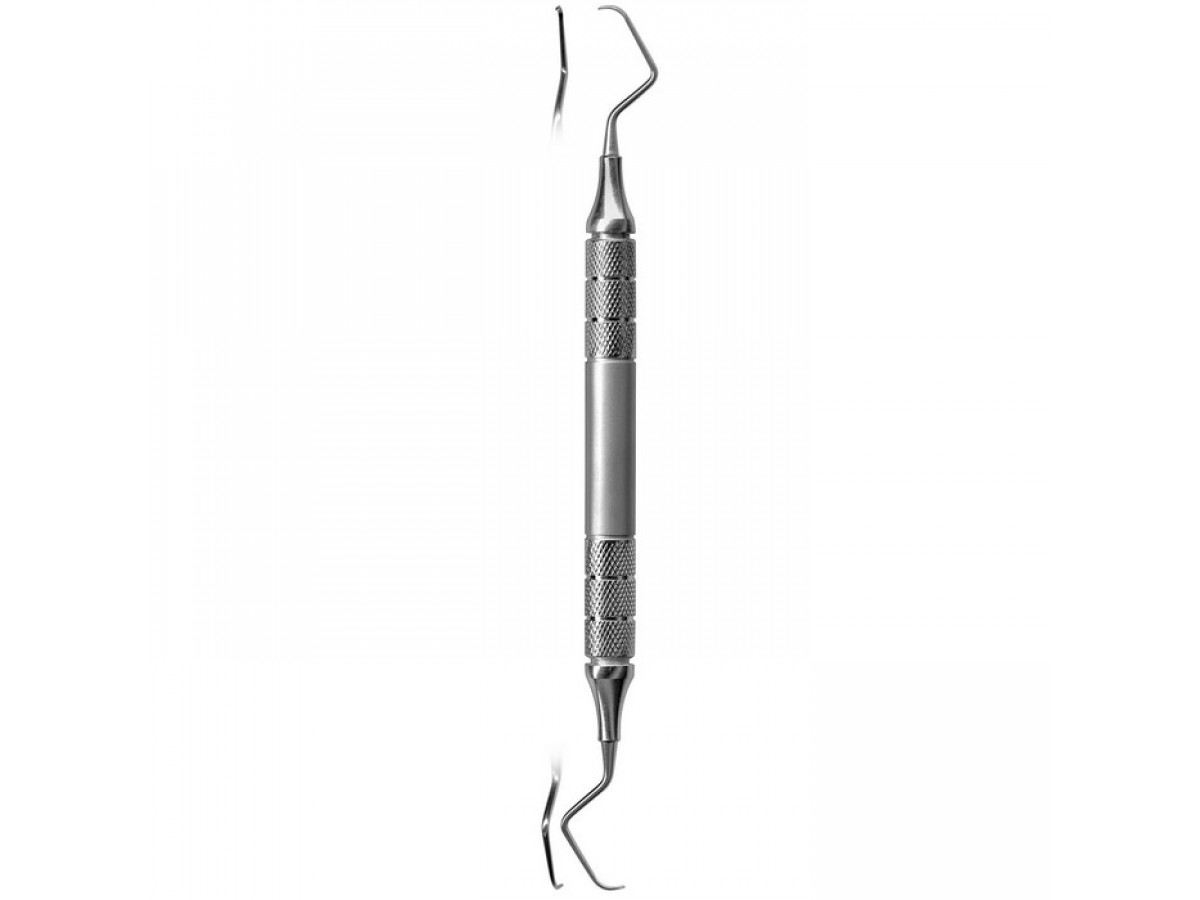 Длина и угол рабочей части облегчает доступ к молярам и сложным участкам корней. Ручка с ретенционным узором обеспечивает удобство использования.
