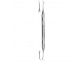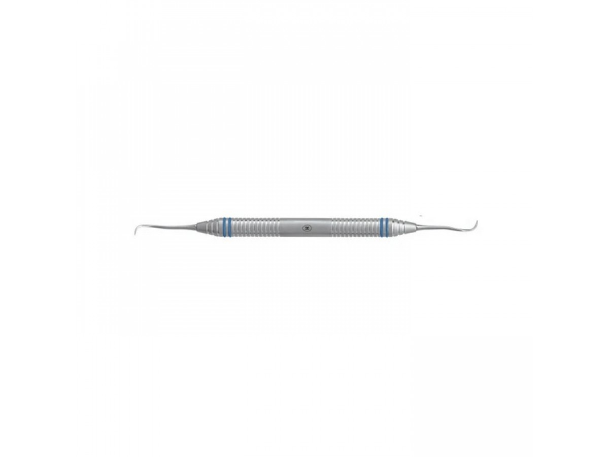 Длинная рабочая часть, одинаковой формы и размеров с обеих сторон, зеркально отраженная. Угол 25°, достигает глубины до 4,5 мм, ширина лезвия 0,9 мм. Ручка с ретенционным узором обеспечивает удобство использования.