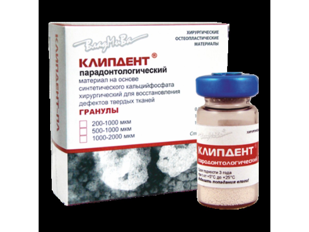 Клипдент пародонтологический материал представляющий собой резорбируемые кальций-фосфатные многослойные гранулы с пролонгированным высвобождением активных действующих веществ. Производитель: Владмива, Россия.