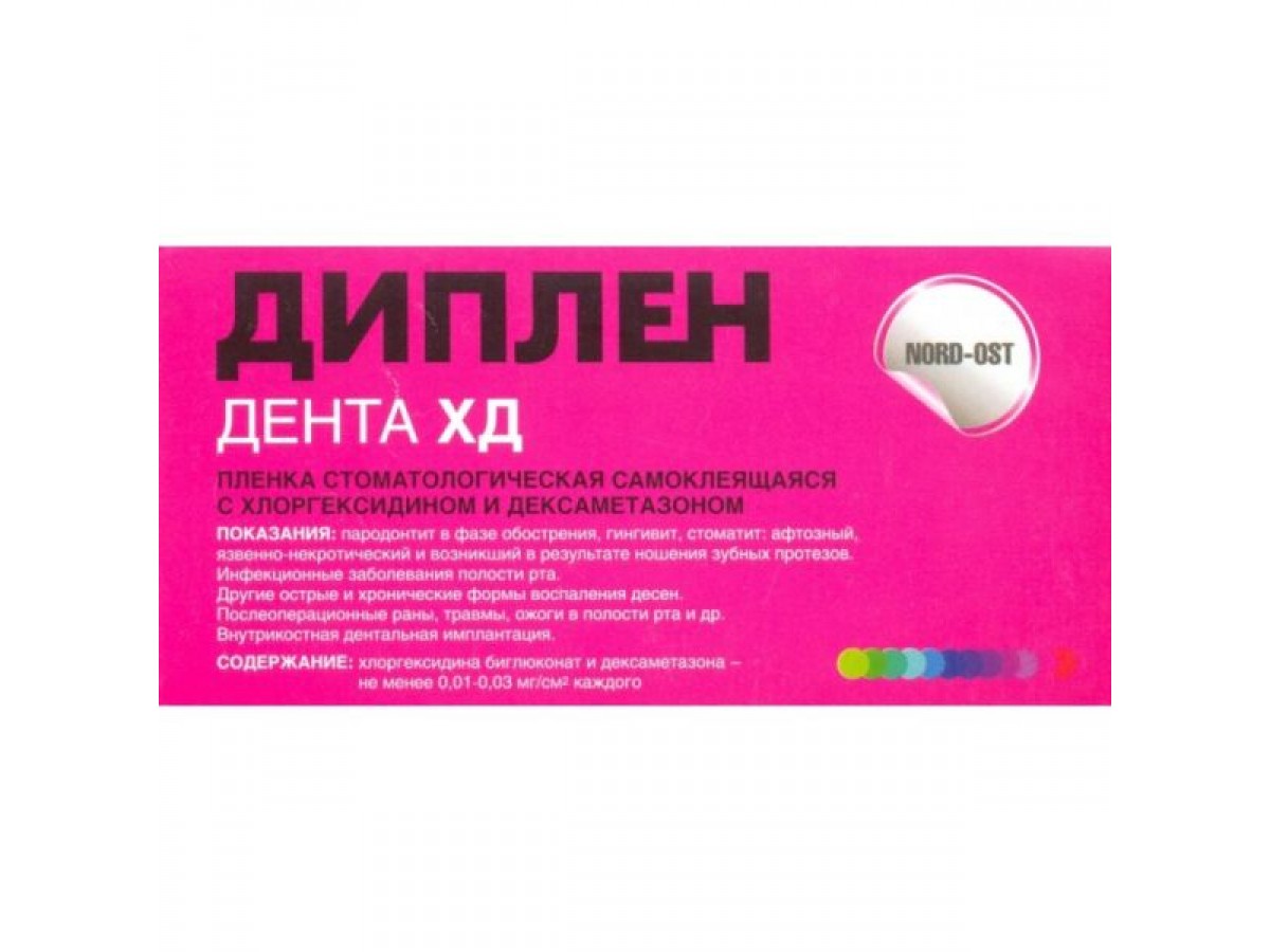 Диплен-Дента ХД - адгезивная самоклеящаяся стоматологическая пленка с комбинированным действием, содержащая биглюконат хлоргексидина и дексаметазон в количестве 0,01–0,03 мг/см2 для лечения воспалительных и инфекционных заболеваний полости рта (гингивиты, стоматиты, пародонтиты). Производитель: «Норд-Ост», Россия.