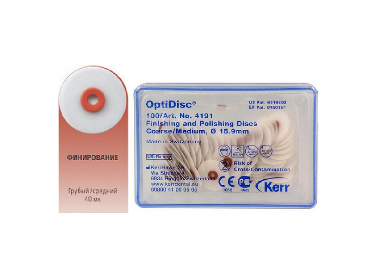 OptiDisc - это эффективная система дисков для финирования и полировки, позволяющая придать реставрации зеркальный блеск, сходный с блеском естественных тканей зубов. В систему OptiDisc® входят диски с абразивными частицами различного размера для контурирования, финирования и полировки до зеркального блеска композитов, стеклоиономеров, амальгамы, полудрагоценных и драгоценных металлов. Производитель: Kerr, Швейцария.