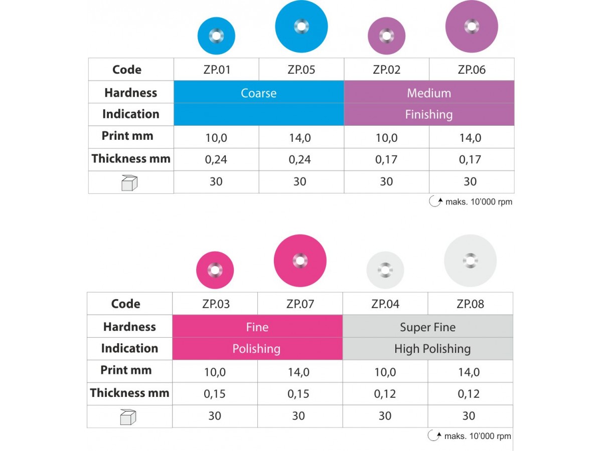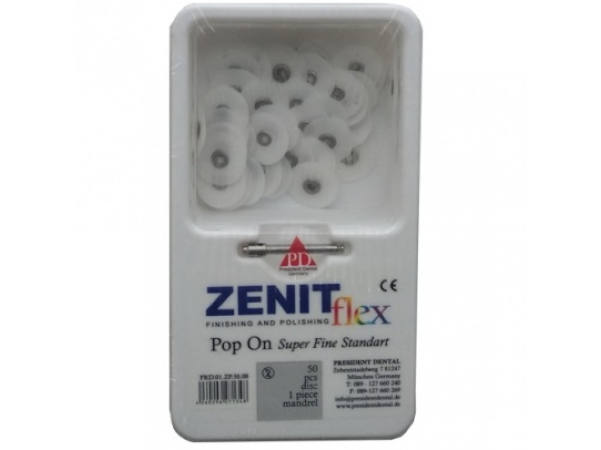 Диски Zenit Flex Pop On отличает высокая износоустойчивость, хорошая шлифующая способность, высокая водоустойчивость. Для достижения идеального результата и удобства работы используют шлифовальные диски от супергрубых до супертонких, а также штрипсы на лавсановой основе, которые являются необходимым элементом шлифовальной системы, так как предназначены для завершающей обработки и полировки интерпроксимальных участков. Производитель: President Dental, Германия.