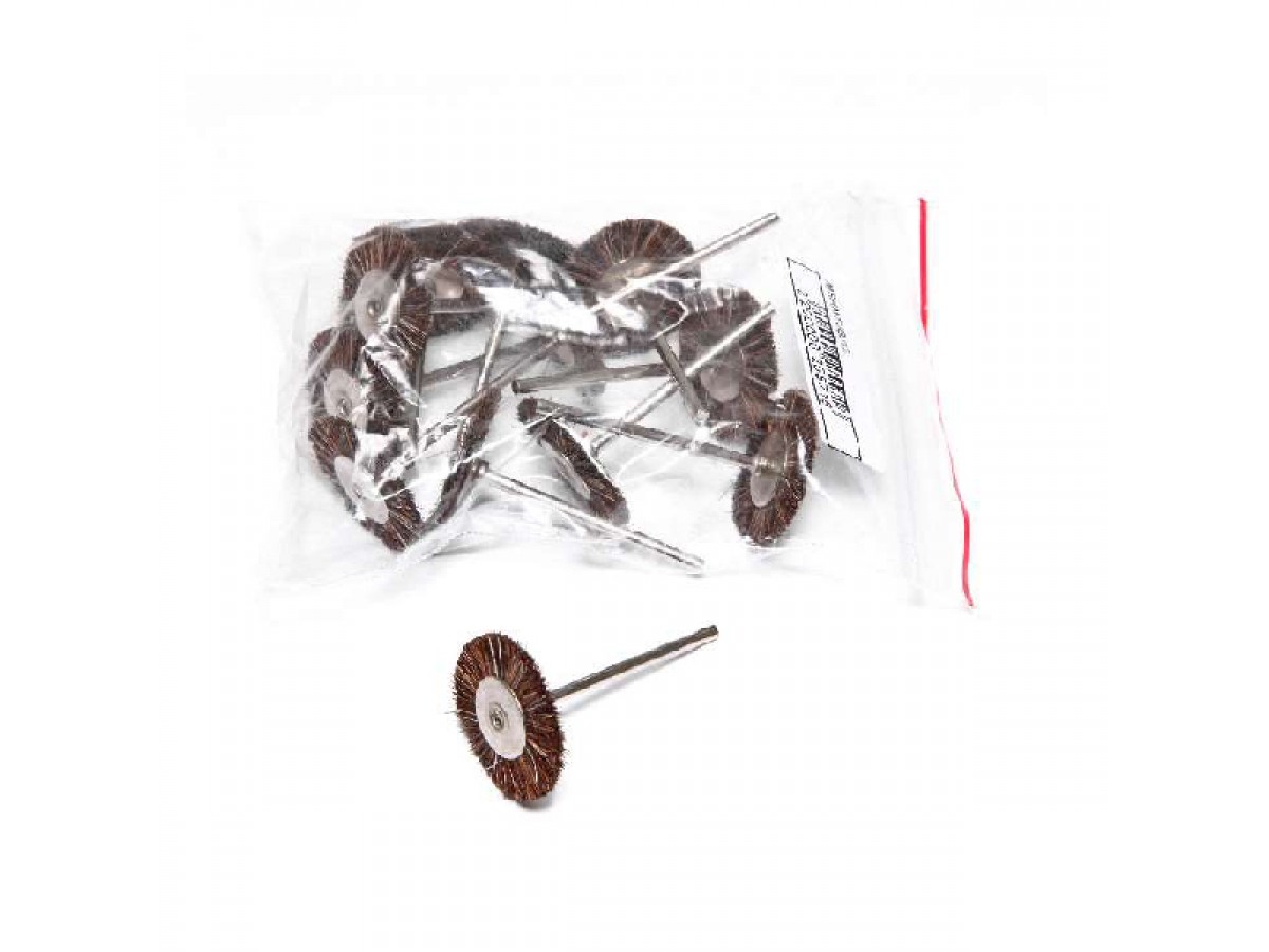 Щёточка MSHM10G зуботехническая, натуральная щетина, коричневая, средней жесткости, на дискодержателе (2,34мм) для шлифовки и полировки изделий из акрила, композитных материалов, керамики и металлов, а также для очистки инструмента. Производитель: Sheshan Songjiang Brush, Китай.