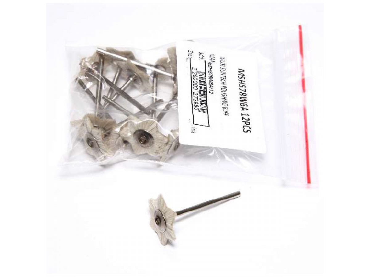 Щёточка полировальная для прямого наконечника MSHS78W6A зуботехническая звёздочка, натуральная щетина, белая, экстра мягкая, на дискодержателе (2,34мм), используется для шлифовки и полировки изделий из акрила, композитных материалов, керамики и металлов, а также для очистки инструмента. Производитель: Sheshan Songjiang Brush, Китай.