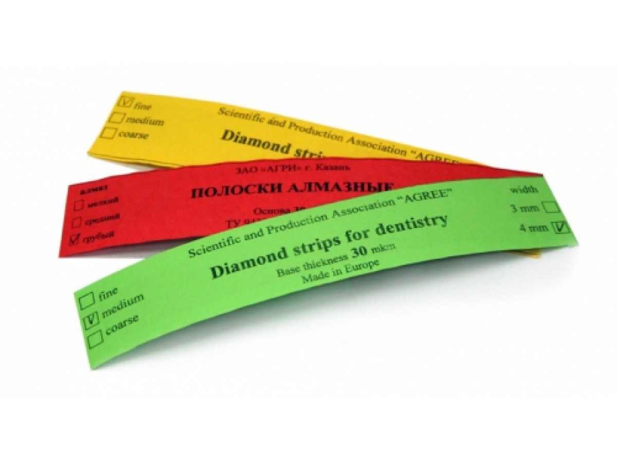 Металлические штрипсы, алмазные предназначены для обработки интердентальной поверхности живого зуба, керамического или пластмассового протеза в клинических условиях. Производитель: АГРИ, Россия.