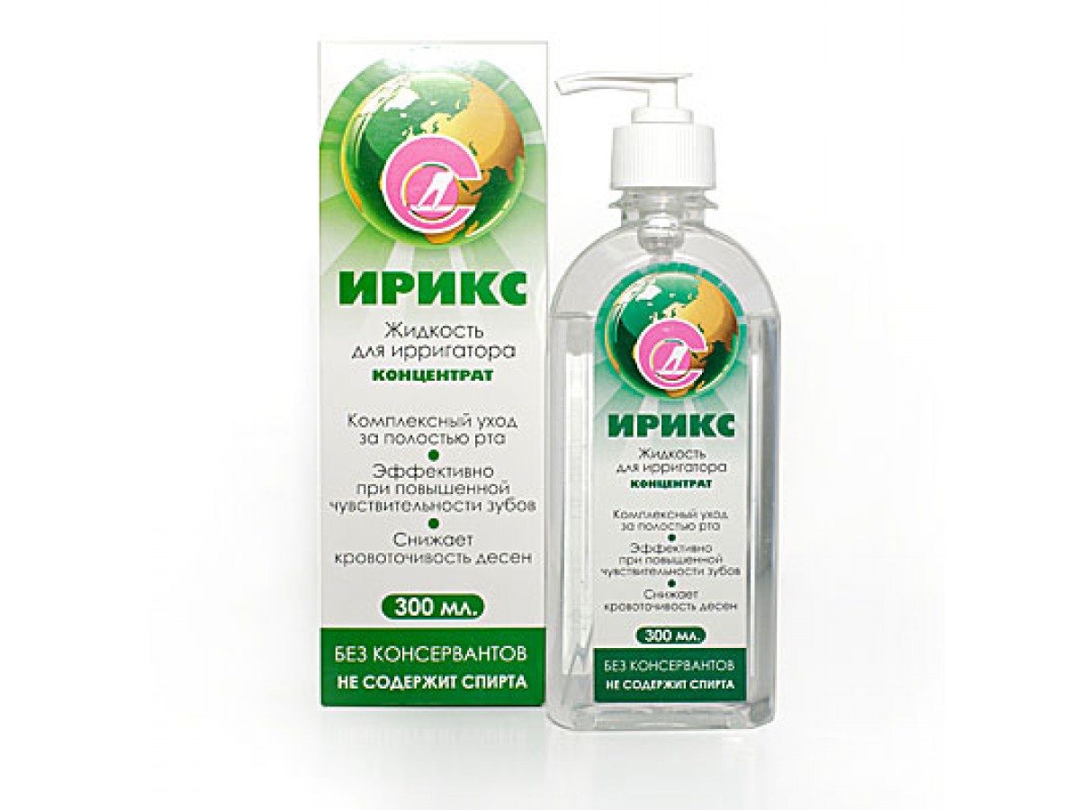 "Ирикс" — это концентрированный ополаскиватель полости рта/жидкость для ирригатора, который используется для эффективного очищения межзубного пространства и зубодесневых карманов от скопления остатков пищи, являясь эффективным средством профилактики заболеваний твердых тканей зубов и мягких тканей полости рта. Производитель: Стомадент, РФ.