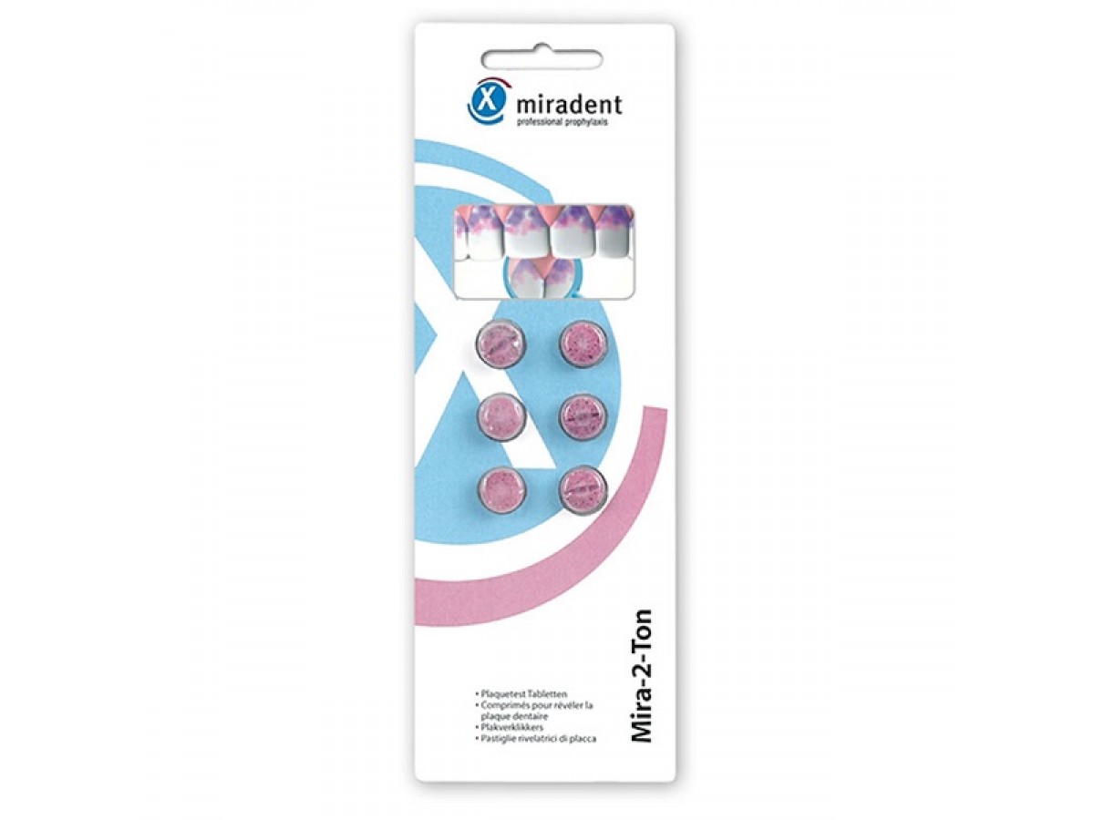 Двухкомпонентное определение: старые зубные отложения окрашиваются в синий цвет, а свежий налёт – в розовый. Производитель: miradent, Германия.