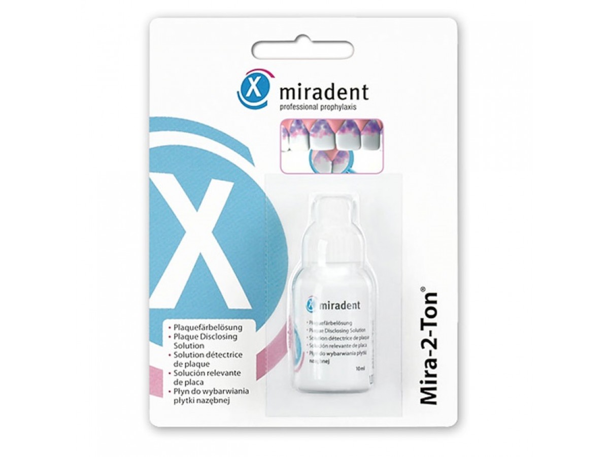 Двухкомпонентное определение: старые зубные отложения окрашиваются в синий цвет, а свежий налёт – в розовый. Таким образом, гигиенист превосходно может указать пациенту на участки зубов, которые он упускает из виду при ежедневной чистке зубов. Производитель: miradent, Германия.