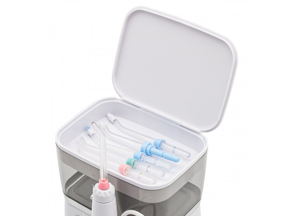 Похожим на стационарные приборы ирригатор Revyline RL 800 делает и объем резервуара в 500 мл.