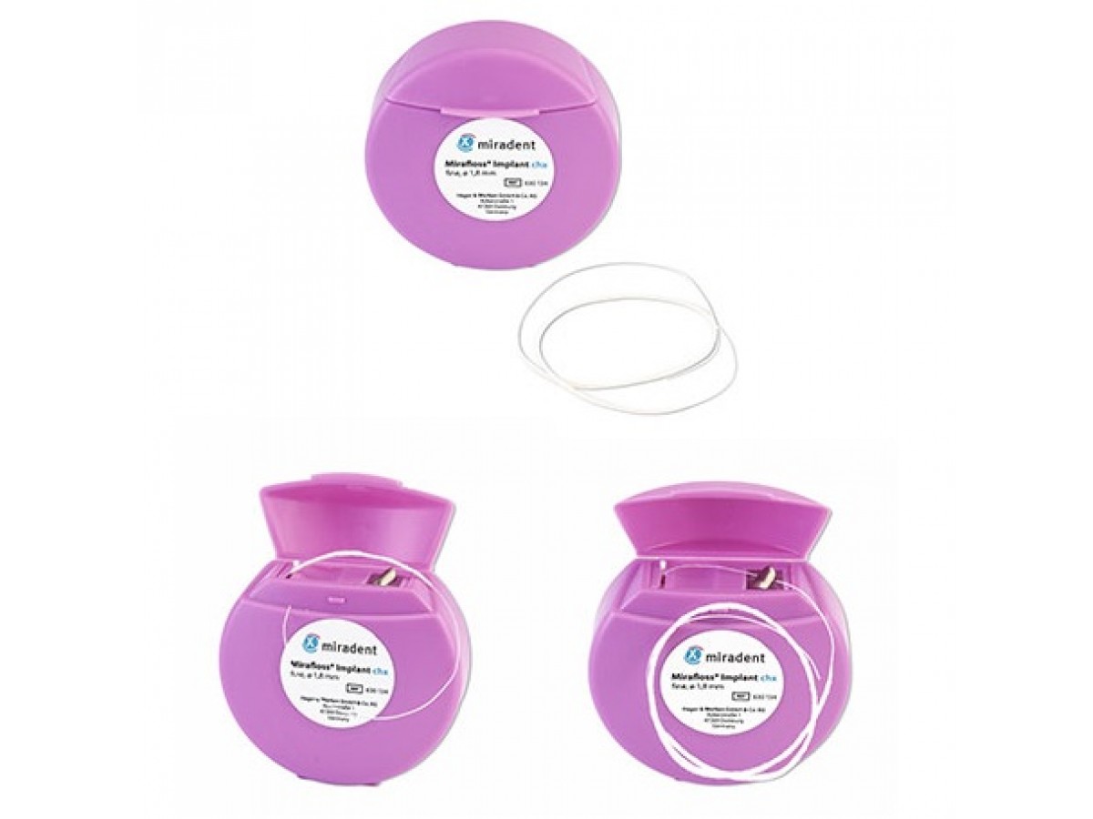 Практичная катушка содержит 50 нитей Mirafloss® Implant chx, которые легко отрезаются встроенным лезвием и извлекаются по одной. Острые концы облегчают вдевание флосса. Средняя часть флосса пропитана 0,2% раствором хлоргексидина, который блокирует размножение бактерий и микроорганизмов и препятствует образованию налёта и тем самым обеспечивает идеальный уход за имплантатами и мостовидными протезами. Производитель: miradent, Германия.
