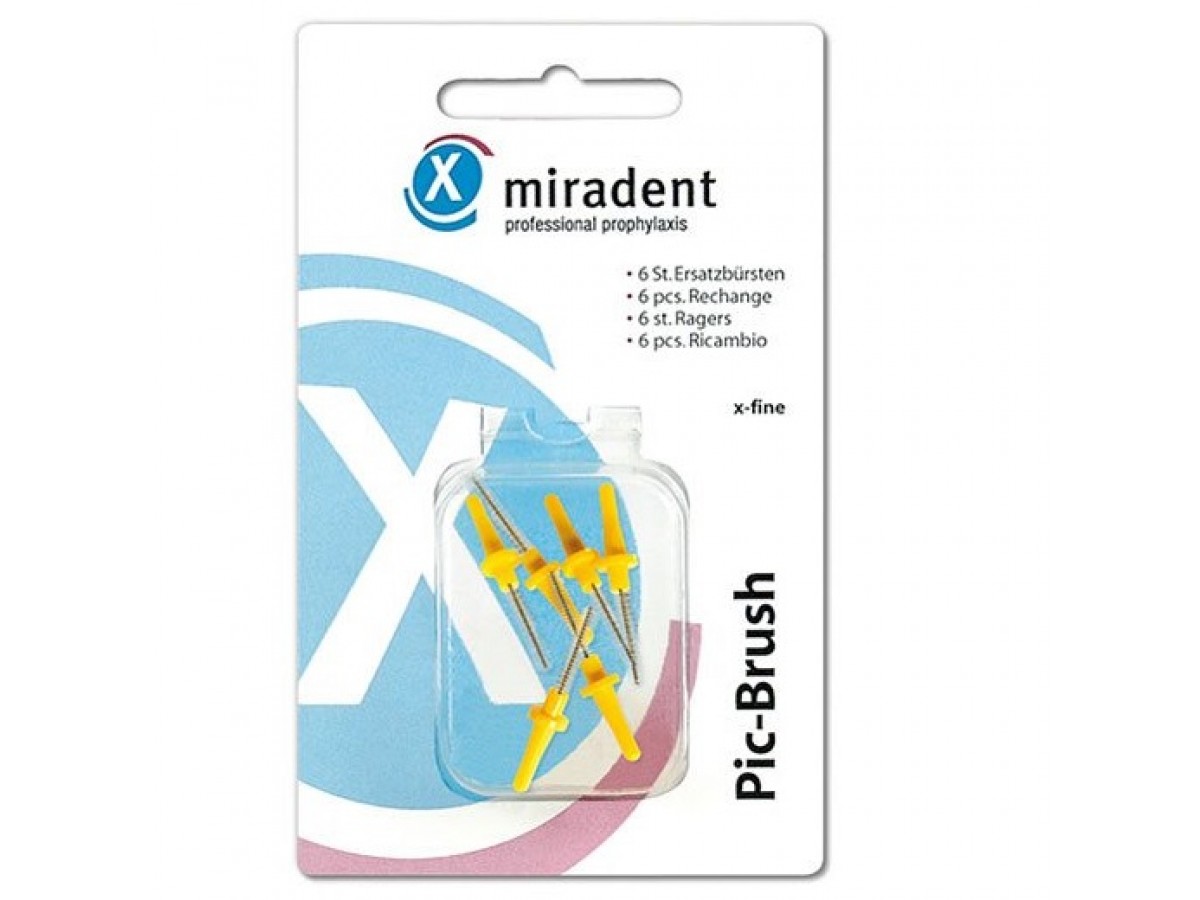 Семь различных по диаметру ёршиков из особой проволоки со специальным покрытием и ультрамягкой щетины, тщательно очищают межзубные промежутки. Производитель: miradent, Германия.