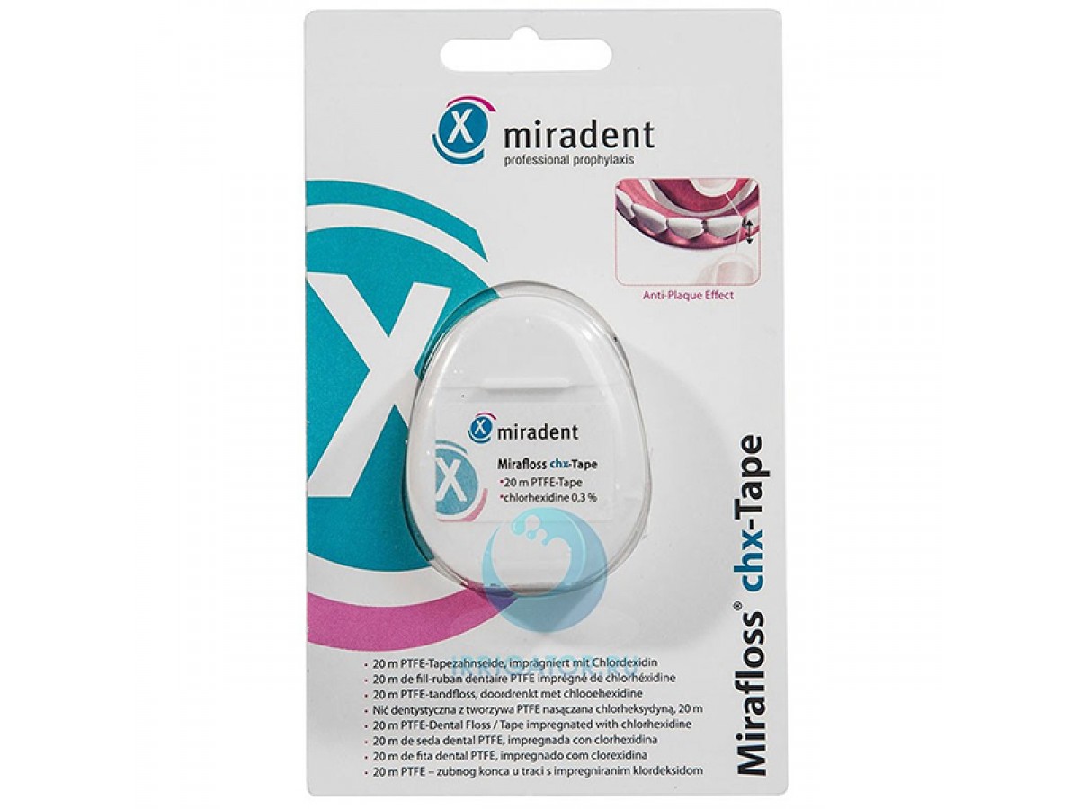 - Зубная нить Mirafloss chx-tape от немецкой компании Miradent пропитана диглюконатом хлоргексидина, благодаря чему она обладает не только очищающим, но и дезинфицирующим свойством. Mirafloss chx-tape оказывает комплексный профилактический эффект: уменьшает количество налета и предотвращает его появление, обладает антибактериальным воздействием, защищает об образования кариеса.