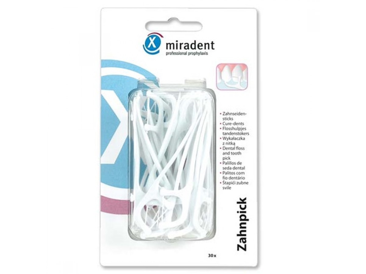 Удобная комбинация зубочистки и зубной нити для эффективного ухода за межзубными промежутками. Производитель: miradent, Германия.