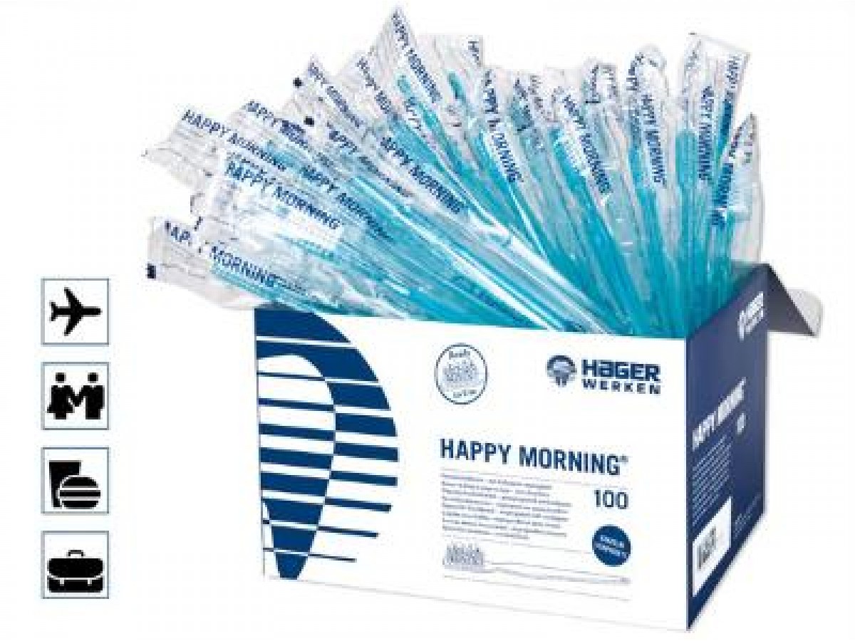 Одноразовая зубная щётка c напылением зубной пасты Happy Morning и короткой головкой для облегчённого доступа к боковым зубам – первая на европейском рынке щетка, готовая к использованию. Производитель: Hager& Werken, Германия.