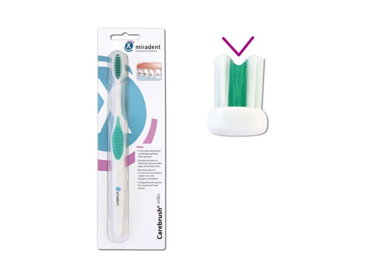 Профессиональная зубная щетка Carebrush Ortho (немецкая компания Miradent) разработана для ухода за зубами, а также за установленными на них ортодонтическими конструкциями. Изделие имеет мягкую (Soft) полиэстеровую щетину, расположенную на компактной головке в форме английской буквы V. Такой дизайн позволяет мягко и эффективно очищать дуги брекетов, замочки, зубные поверхности без риска их повреждения.