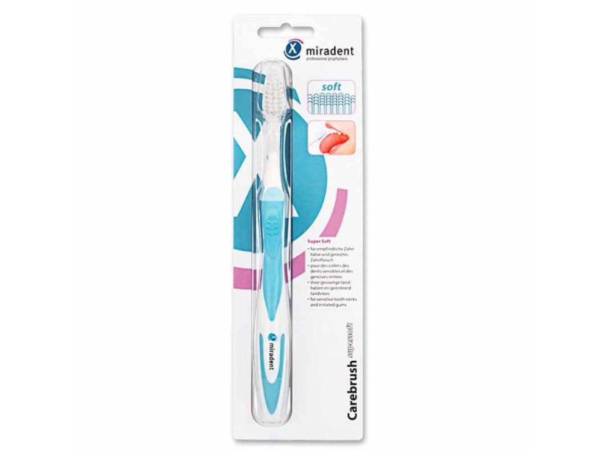 При проблеме открытых шеек зуба и раздраженных дёсен необходим особенно бережный и одновременно интенсивный уход за полостью рта. Зубная щётка Carebrush® supersoft с ультратонкими кончиками щетинок специальной обработки обеспечивает крайне деликатную, при этом тщательную чистку открытых и особенно чувствительных шеек зуба. Головка щетки имеет очень густую щетину, но оптимальную жесткость, что предотвращает образование клиновидных дефектов. Производитель: miradent, Германия.