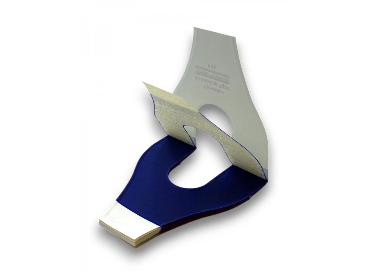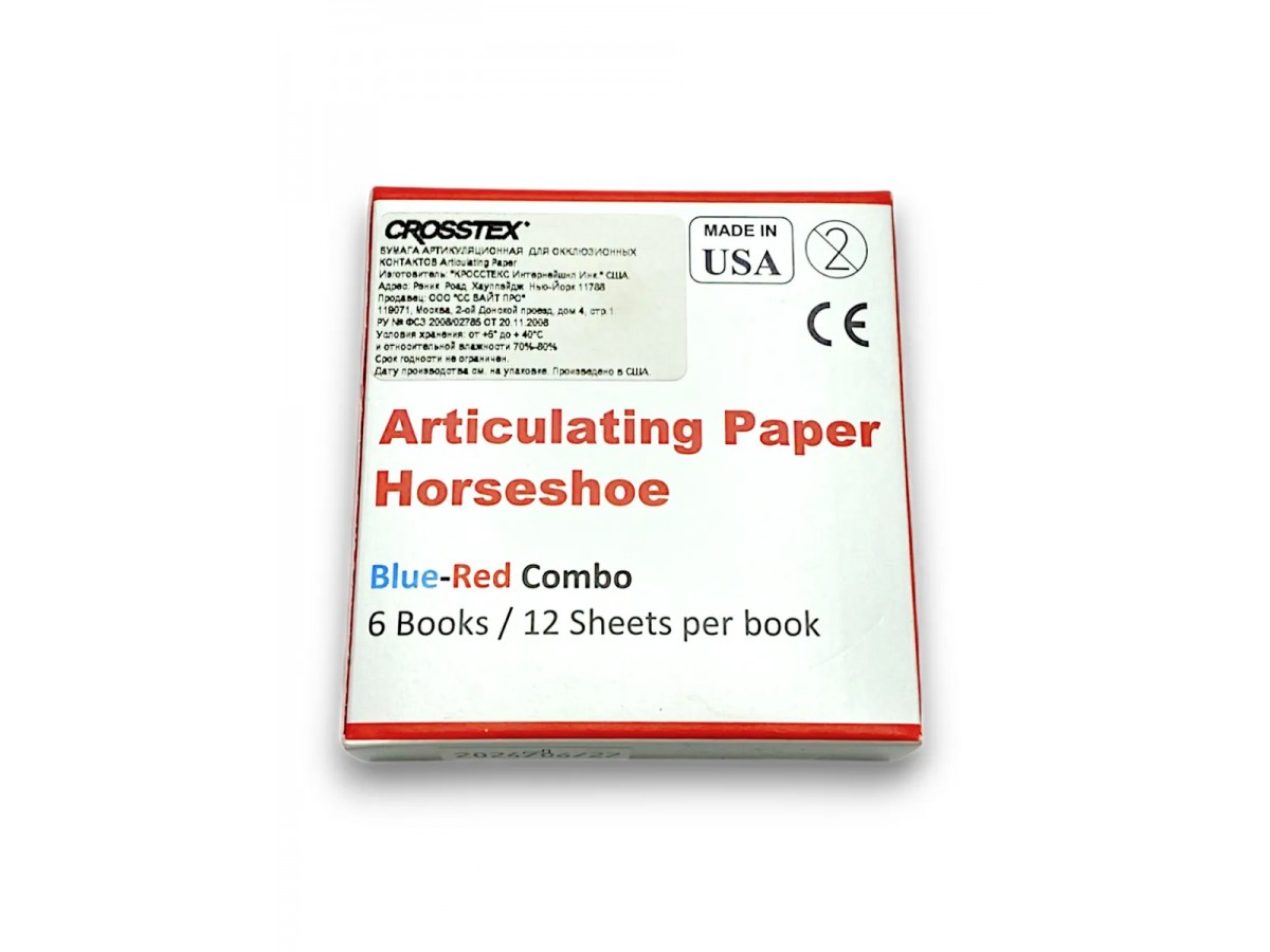 Подковообразная артикуляционная бумага красно-голубая, двухсторонняя - это тонкая, но прочная бумага, покрытая с обеих сторон жидкой краской, для окклюзионных контактов. Дугообразные полоски идеально подходят для пациентов, у которых, из-за патологии височно-нижнечелюстного сустава, при смыкании зубных рядов соприкасаются антагонисты только одной из сторон. Врач может сразу распознать, какая из сторон предпочитается при жевании. При окклюзионной проверке общих съёмных протезов, преимущественно таких, которые припасованы в соответствии с концепцией билатерально сбалансированной окклюзии, желательно получить отпечатки равной интенсивности на всех контактных пункта. Производство: Crosstex, США.