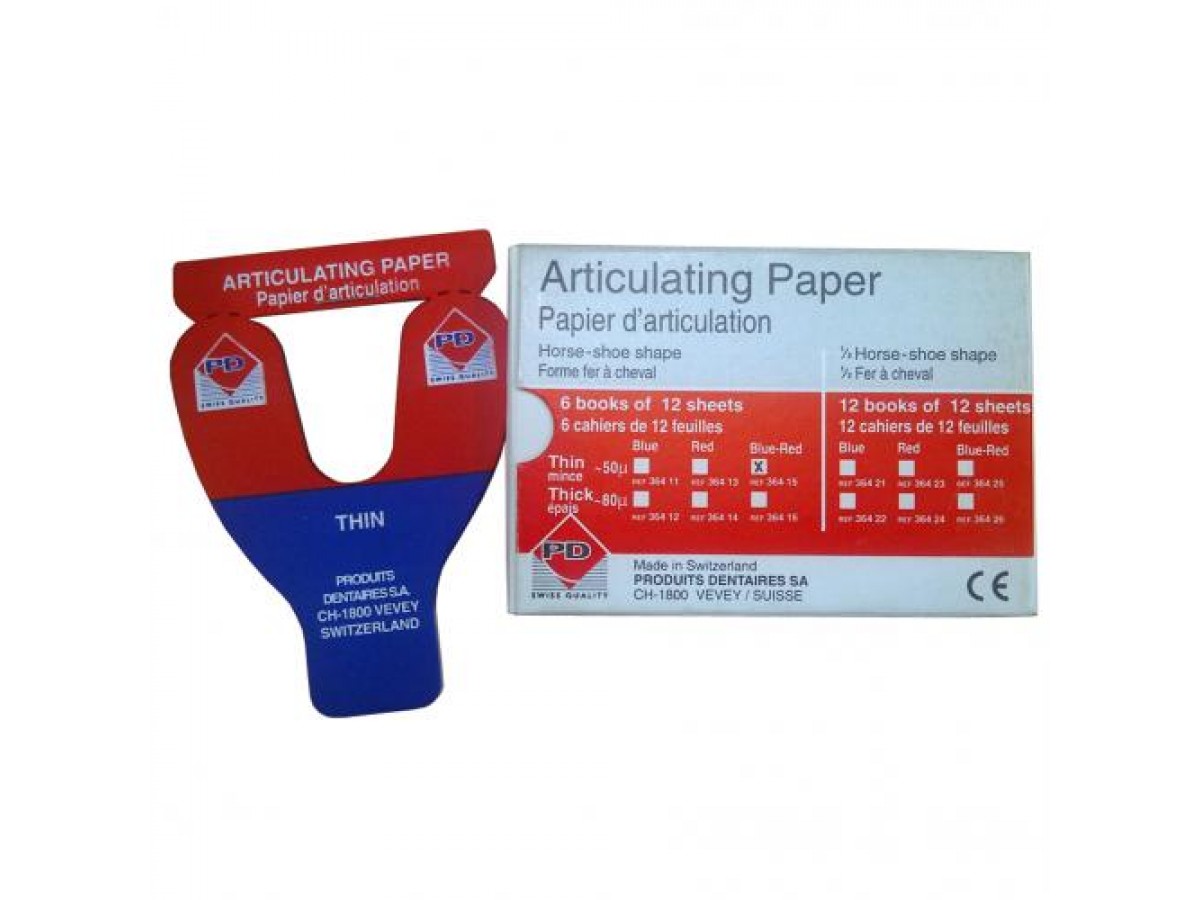 Артикуляционная бумага C- (половина подковы) двухцветная (сине-красная) является диагностическим инструментом, используемым для выделения окклюзионных контактов и распределения окклюзионных сил. Производство: PD, Швейцария.