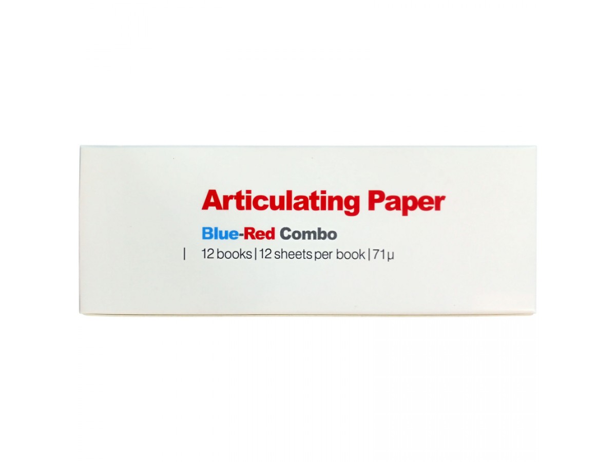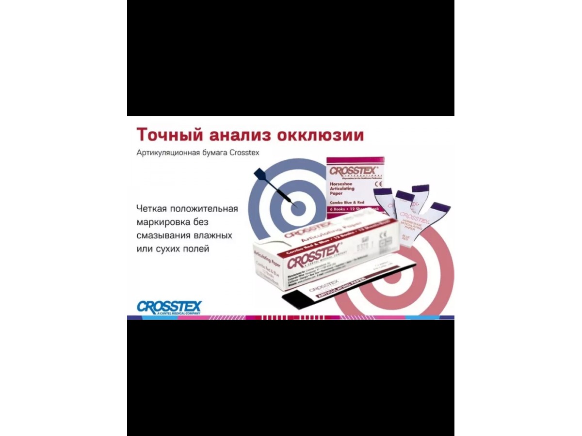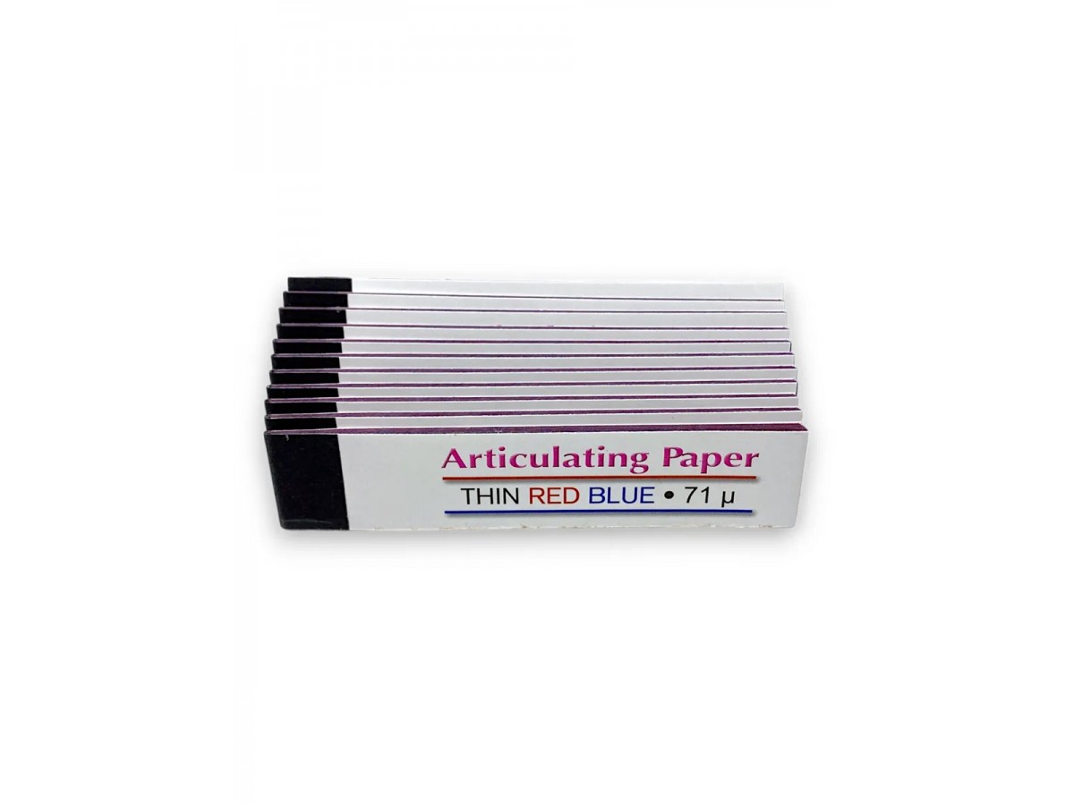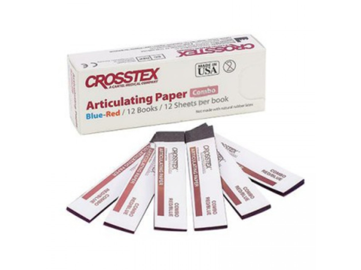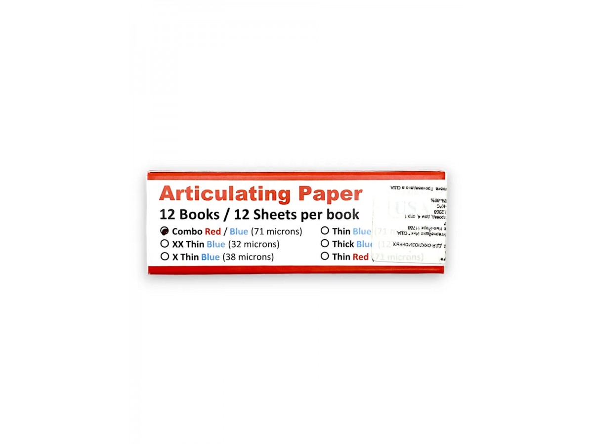 Бумага артикуляционная прямая, двухсторонняя красно-синяя - это артикуляционная бумага с прогрессивным выделением цвета, которая служит для отображения статической окклюзии. Структура мягкой артикуляционной бумаги пропитана краской, которая проявляется при надавливании. Производство: Crosstex, США.