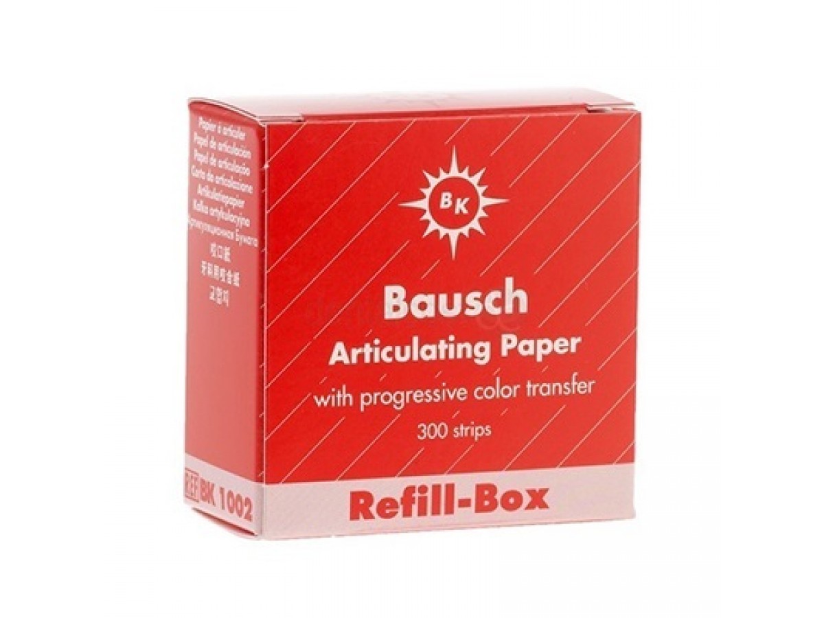 Артикуляционная бумага BK 1002 — это артикуляционная бумага Бауш прямая толщиной 200 мкм, с нарастающей интенсивностью цвета является единственным видом бумаги, позволяющим представить жевательную силу различной интенсивности в виде цветных отображений с оттенками, зависящими от величины нагрузки. После первичной обработки завышенных контактов следует в дальнейшем использовать более тонкие проверочные средства. Производство: Bausch, Германия.