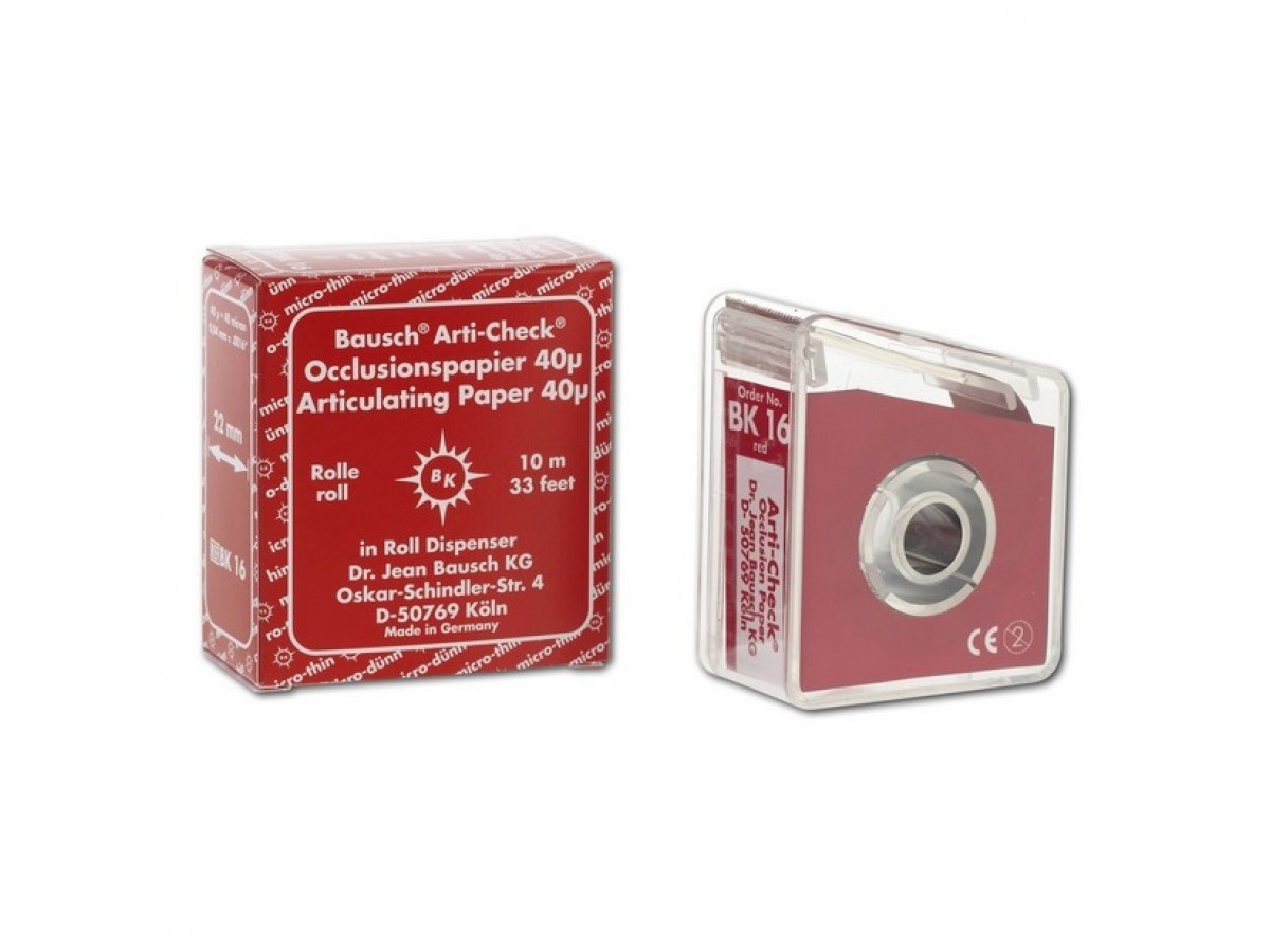 Артикуляционная бумага ВК 16 — это окклюзионная бумага Бауша микродюн, толщиной 40 мкм, которая является очень тонкой и, в то же время, прочной бумагой, покрытая с обеих сторон жидкой краской. Производство: Bausch, Германия.
