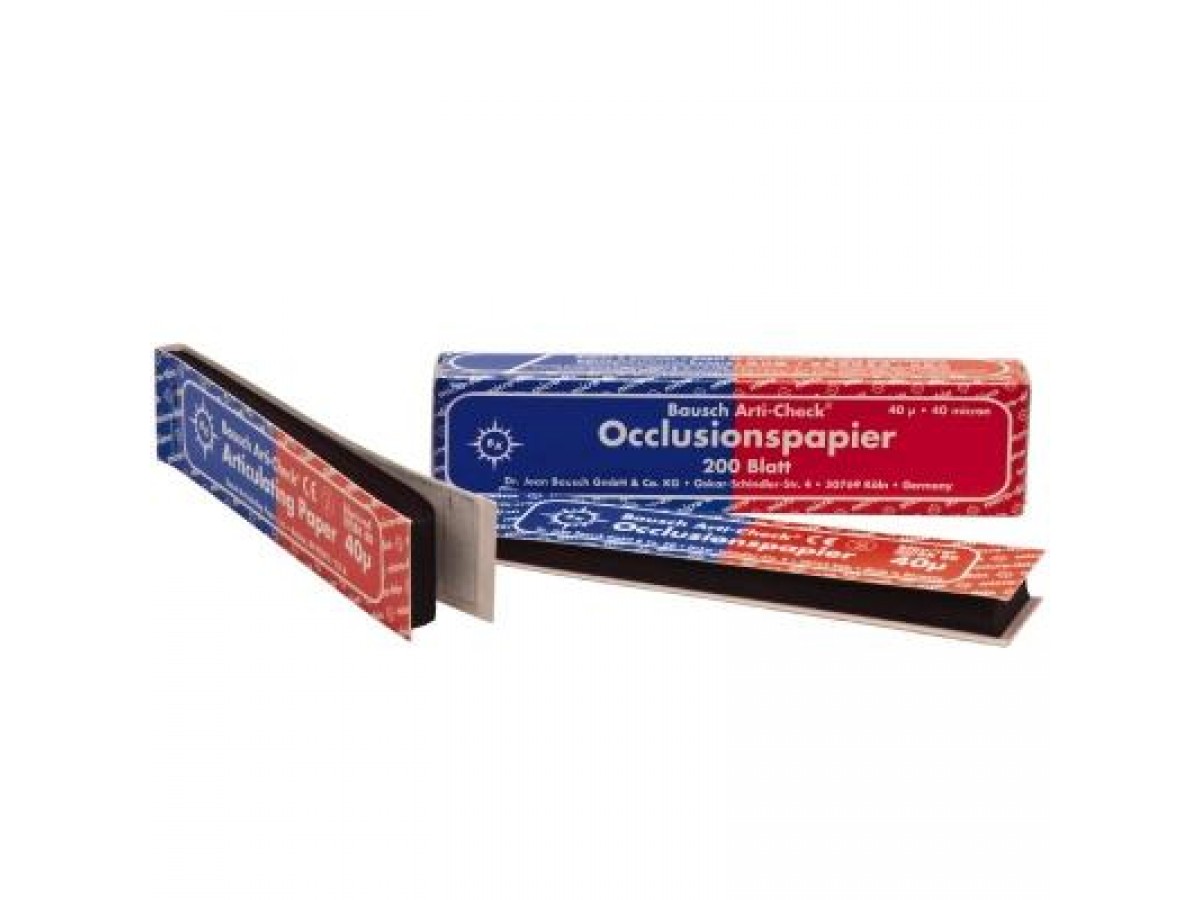 Окклюзионная бумага Бауша микродюн толщиной 40 мкм особенно хорошо подходит для двухцветной демонстрации статической и динамической окклюзии. Для этого на первом этапе окрашиваются в красный цвет все контактные пункты в положении центральной окклюзии, а затем проводится второй этап с окраской динамических контактных пунктов в синий цвет. Использование синей бумаги на первом этапе и красной бумаги на втором этапе также даёт хорошие результаты.