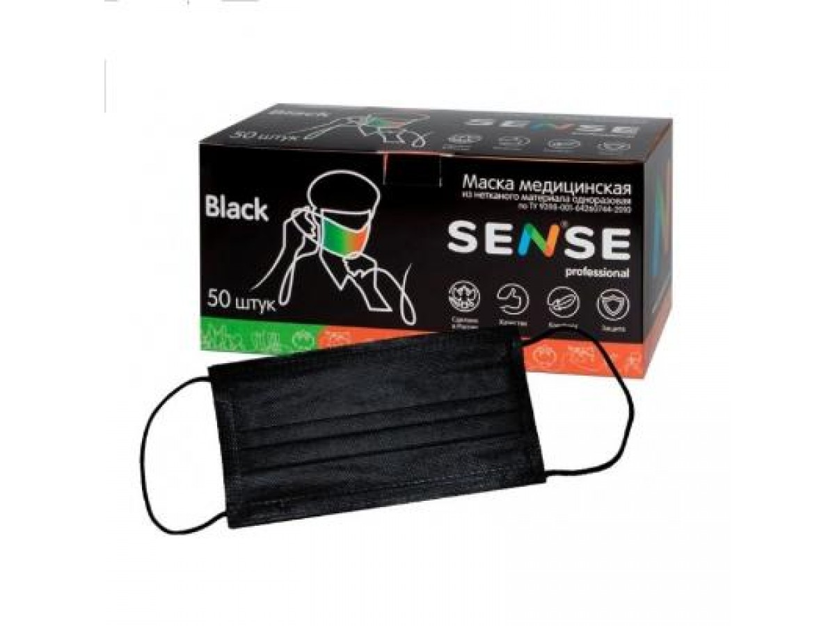 - Маски Sense трехслойные черные — 50 шт. в картонной упаковке.