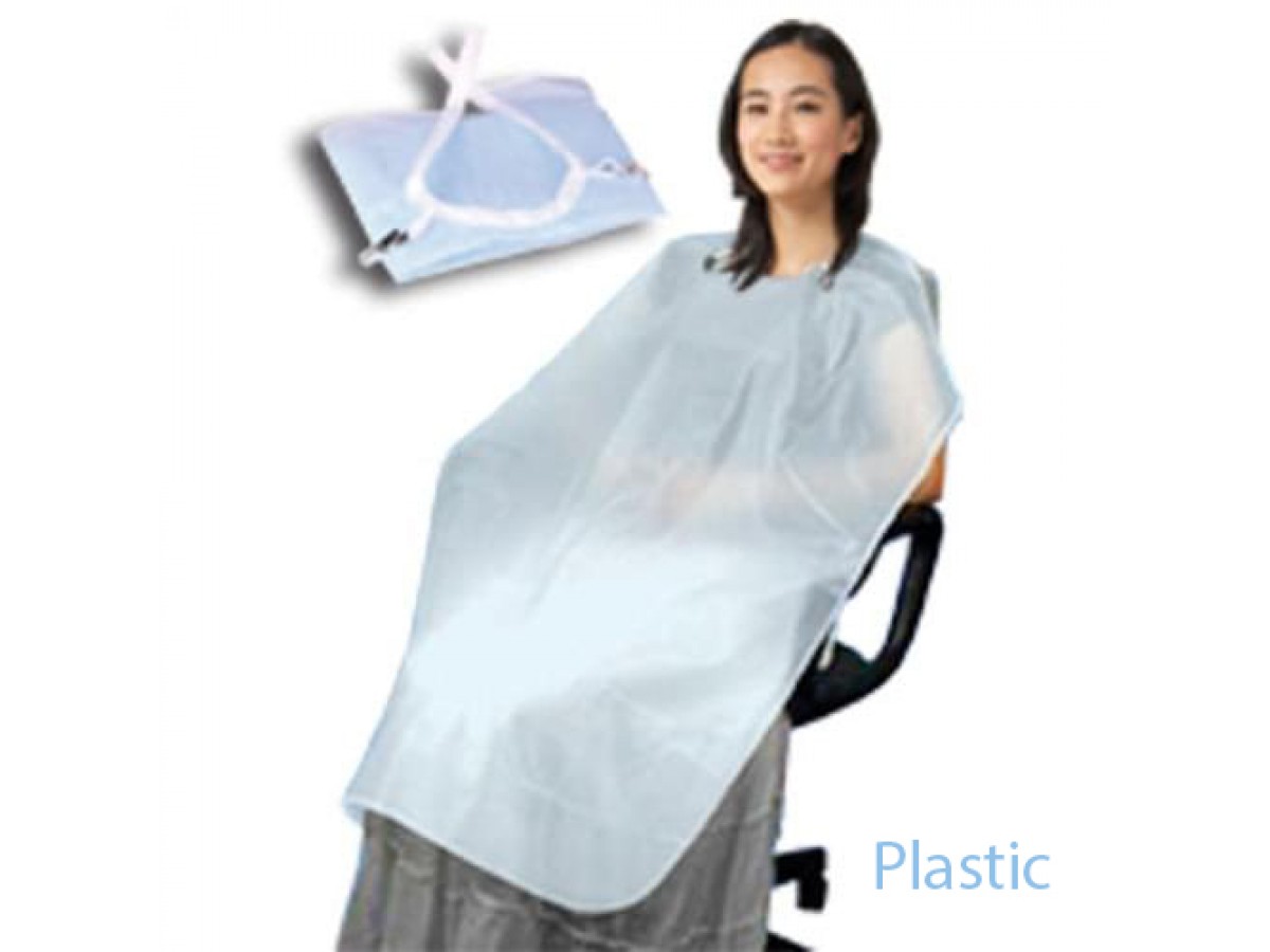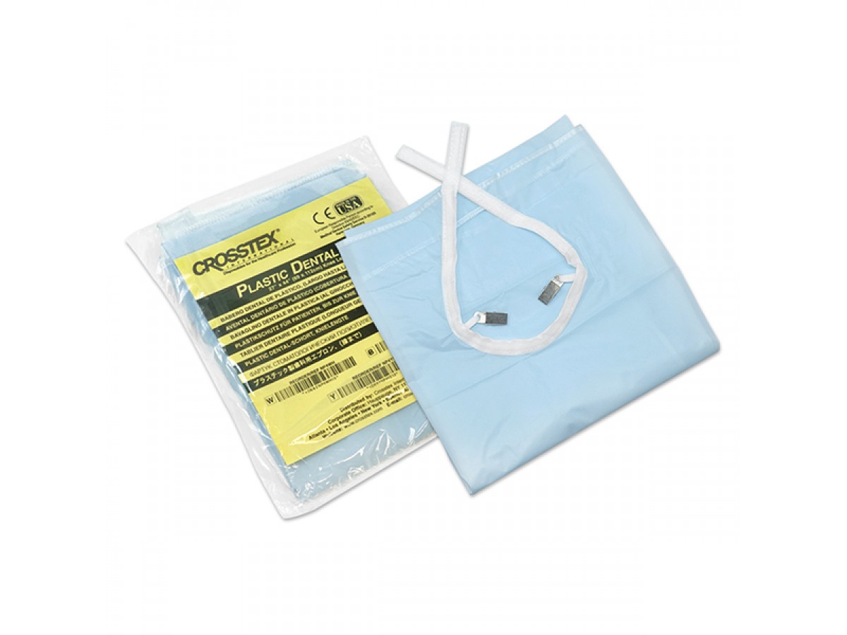 Пластиковый барьерный фартук длиной до колен. Два зажима "крокодила" на шейном ремешке для удержания нагрудника пациента. Можно вытереть начисто. Производитель: Crosstex, США.