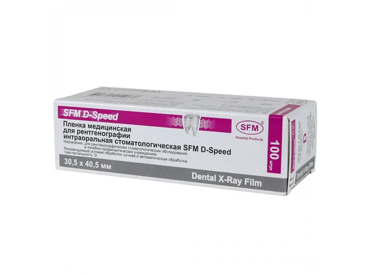 Рентгеновская пленка для стоматологии SFM D-Speed - зеленочувствительная, адаптирована к аппаратуре на средне-жесткой основе, представляет собой двусторонне эмульсированный фотографический материал, сенсибилизированный в зеленой части спектра. Производитель: SFM Hospital Products GmbH, Германия.