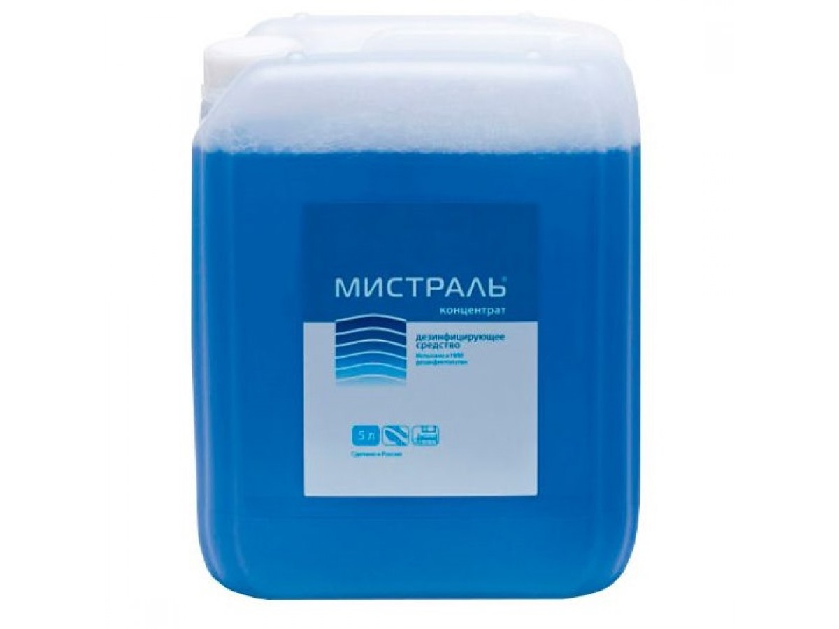 Мистраль - дезинфицирующее средство (концентрат). Прозрачная жидкость от светло-голубого до синего цвета со слабым цитрусовым запахом, хорошо смешивающаяся с водой. Производитель: Вита-Пул, Россия.