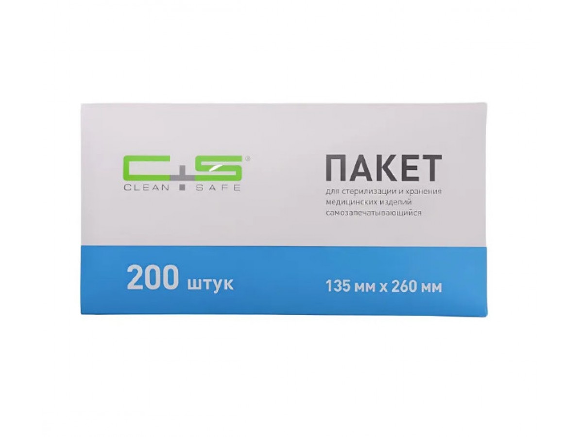Пакет для стерилизации и хранения медицинских изделий, самозапечатывающийся размера 135 мм х 260 мм. Производитель: Clean+Safe, Малайзия.
