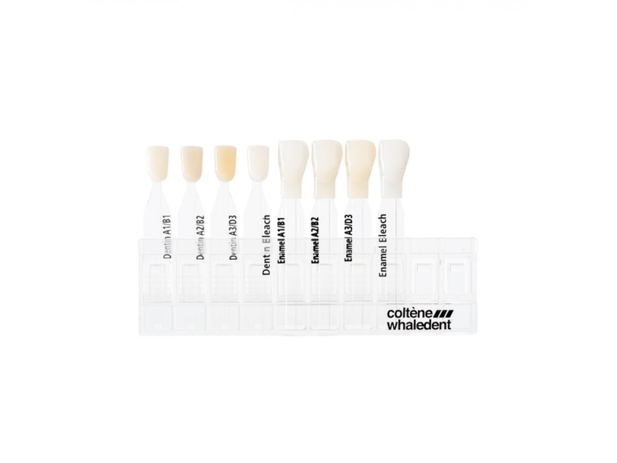 Уникальность расцветки заключается в возможности наложения эталона эмали (оболочка) на эталон дентина (ядро). Это позволяет оценить правильность выбора оттенков с точки зрения имитации ими тканей зуба, оценить естественность цвета, прозрачность и опаковость.