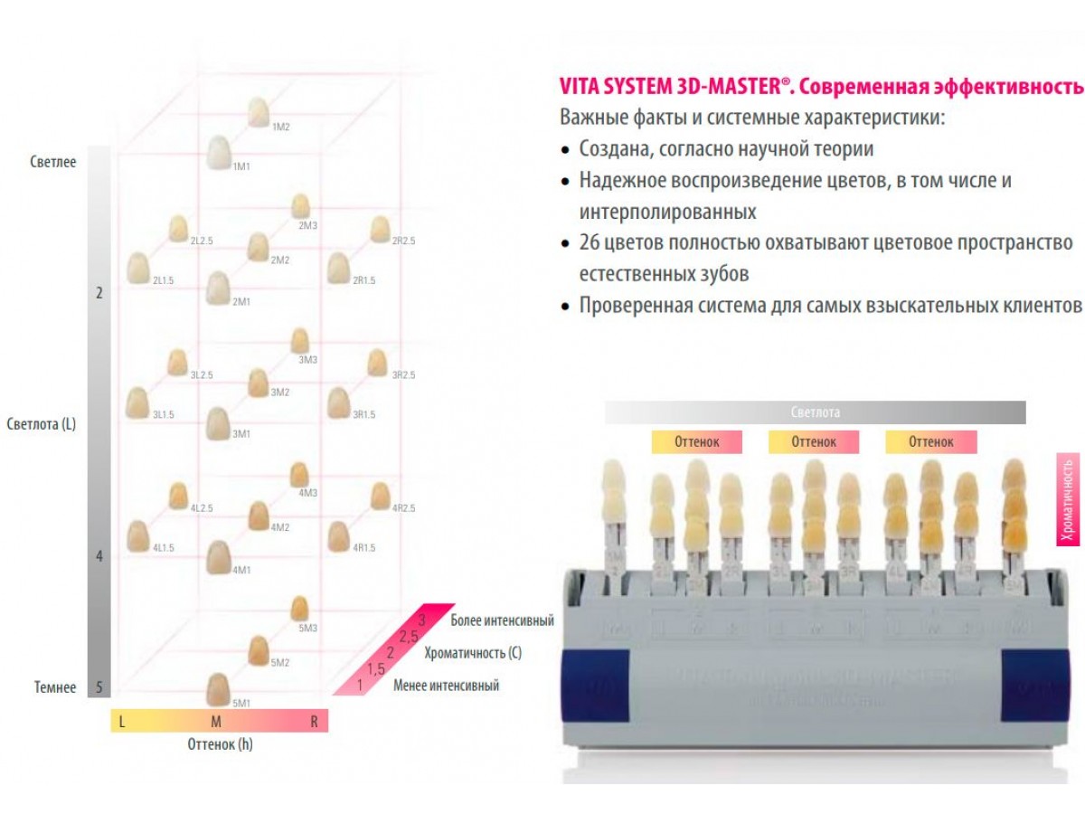 - Логичное и последовательное построение цветовой системы VITAPAN 3D-MASTER согласно колориметрическим критериям, дает возможность без затруднений и быстро сделать однозначный выбор цвета зуба, что, в свою очередь, является необходимой предпосылкой для его точного воспроизведения в керамике.