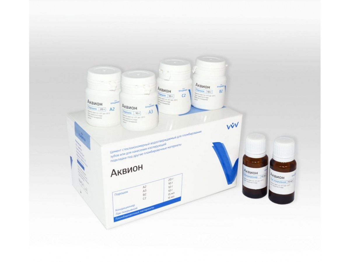 Стеклоиономерный водоотверждаемый материал “Аквион” состоит из смеси алюмофторсиликатного стекла и полиакриловой кислоты. Замешивается на дистиллированной воде с образованием быстротвердеющего пломбировочного материала, обеспечивающего хорошую адгезию к эмали и дентину и плотное краевое прилегание.