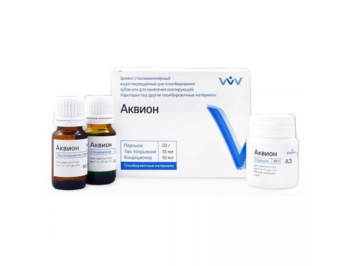 - «Аквион» обладает высокой биологической совместимостью с тканями зуба, прочностью, низкой растворимостью. Пролонгированный противокариесный эффект обеспечивается за счет выделения ионов фтора.