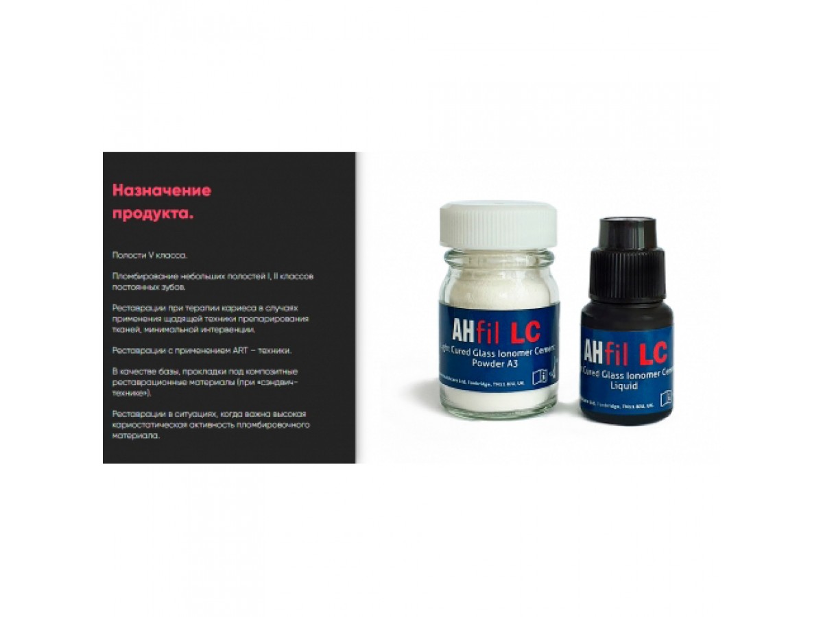 AHfil LC (Цвет А3) - Cтоматологический cтеклоиономерный цемент для реставрации, модифицированный (усиленный) композитной смолой. Светоотверждаемый цемент, твердеющие в результате химического взаимодействия кислотно основного типа и, дополнительно, для ускорения процесса твердения и достижения оптимальных свойств цемента, под воздействием активирующего света (для активации реакции мономера (смолы)). Производитель: AHL, Англия.