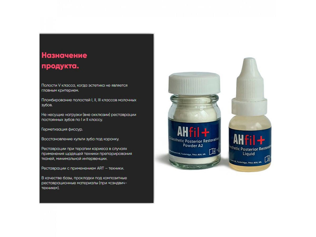 AHfil+ Cтоматологический cтеклоиономерный цемент для реставрации, обеспечивающий высокую прочность и износостойкость. Оптимальный выбор в случаях применения щадящей техники обработки тканей зуба, минимальной интервенции. Идеален для использования при реставрациях жевательной группы зубов. Производитель: AHL, Англия.