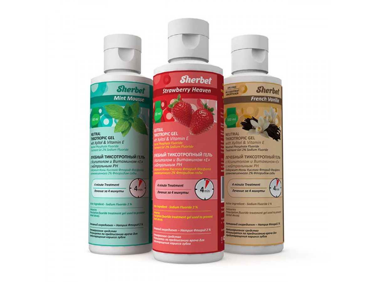 Sherbet Neutral Thixotropic Gel – реминерализующий рН-нейтральный тиксотропный гель, содержащий 2% ионов фтора (ppm 9.000). Производитель: Sherbet, США.