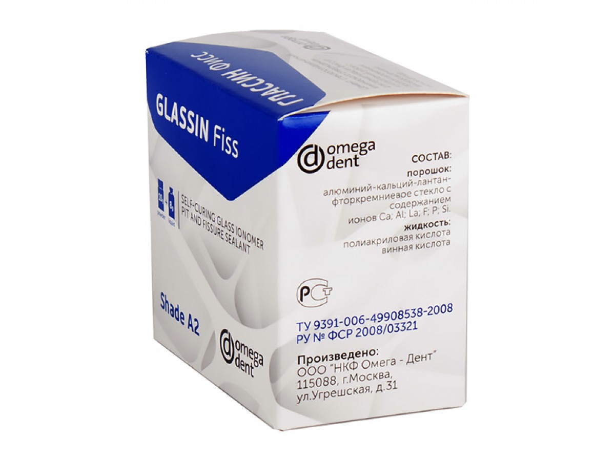 Глассин Фисс – стеклополиалкенатный (стеклоиономерный) материал, предназначенный для закрытия углублений и фиссур жевательных зубов, пломбирования некариозных поражений, протекающих без размягчения тканей, изолирования поверхности при наличии сильно обнаженной шейки зуба. Также используется в качестве подкладки под пломбы всех видов. Производитель: ОмегаДент, Россия.