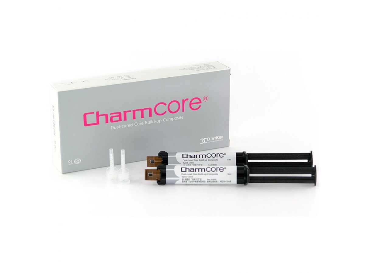 Материал CharmCore (ЧамКор) имеет механизм двойного отверждения: самоотверждение (происходит под действием химических агентов) и отверждение под воздействием внешних источников энергии. Отличается высокой прочностью на сдавливание (более 50 МПа) и низкой истираемостью . Производитель: DentKist, Корея.