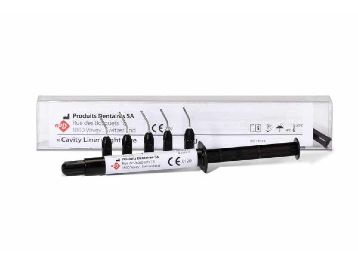 Cavity Liner — это однокомпонентный светоотверждаемый рентгеноконтрастный материал на основе гидроксида кальция и диметилакрилата. Обладает высокой стабильностью и устойчивостью к растворению, а также отличной адгезией к пломбировочным материалам. Используется как лечебный прокладочный материал, в качестве изолирующей прокладки и для непрямого покрытия живой пульпы. Имеет щелочную реакцию pH~12, понижает чувствительность зубов и обладает бактерицидным эффектом. Производство: Produits Dentaires SA, Швейцария.