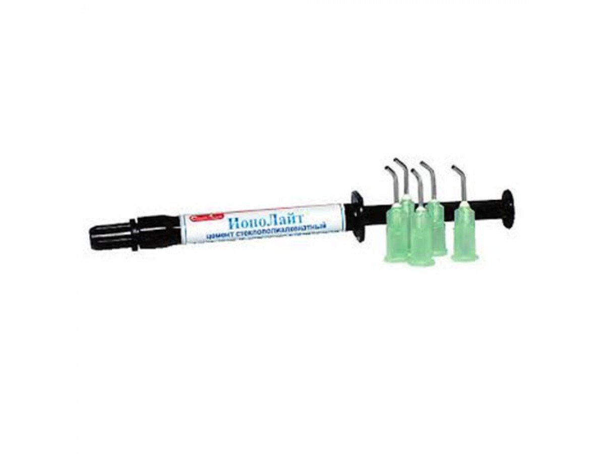 Ионолайт - стеклополиалкенатный композитный цемент светового отверждения текучей консистенции (прокладки, выравнивание дна полости, запечатывание фиссур, пломбирование по V классу). Производитель: СтомаДент, Россия.